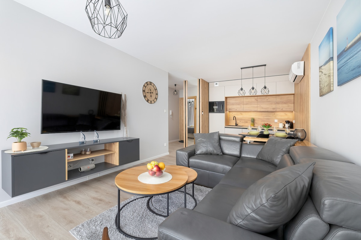 New, comfortable apartment with access to the spa area, which includes: swimming pool, sauna, jacuzzi, paddling pool for children and gym. The apartment includes a place in the underground , closed car park . The Water Wings apartment consists of a livin