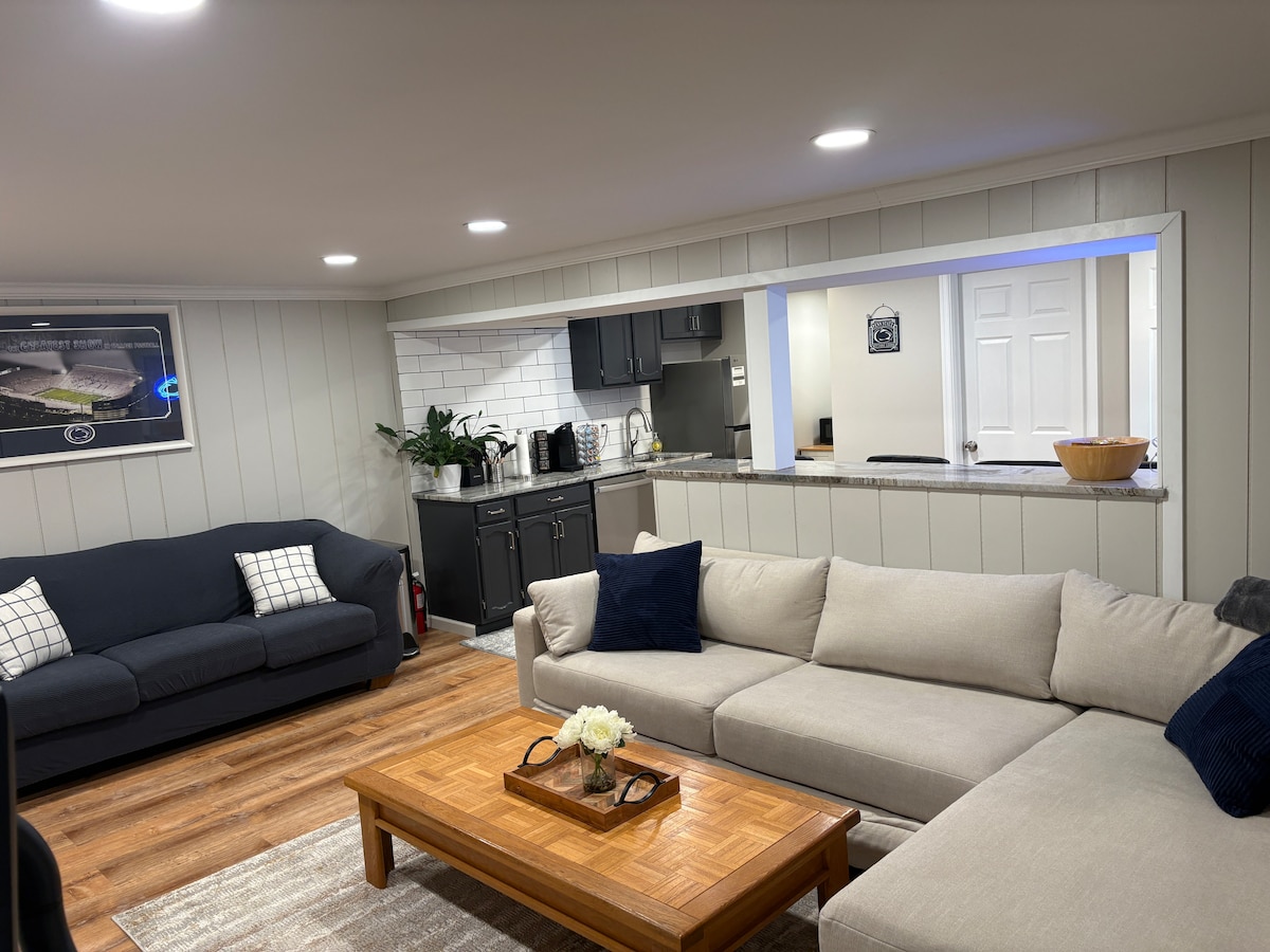 For rent is a new, fully-furnished basement guest suite with a private entrance, 2 bedrooms, bathroom, full kitchen, wall mounted 55" smart tv, wifi. This property is walking distance to Beaver Stadium or the Bryce Jordan Center via University drive (approximately 1.1 miles). Our ideal group varies. It could be 2 couples (young or old), parents with kids, or just a few friends. The apartment comfortably sleeps 6. Located in State College Borough. ONE TURN to get to the stadium!!!