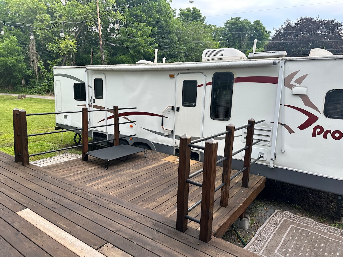 Enjoy a peaceful setting 3 miles from Beaver Stadium and downtown State College. This fully-equipped RV offers electric, heat, A/C, bathroom, and kitchen. It features a queen bedroom, couch that converts to sleep 2, an overhead bunk, and dining table that converts into a bed. Sleeps 4-6 comfortably. You’ll have the entire RV to yourself. Linens, bedding, kitchen supplies (including a Keurig, ice maker, pots, pans, and utensils) provided. Offers a relaxing outdoor patio area as well.
