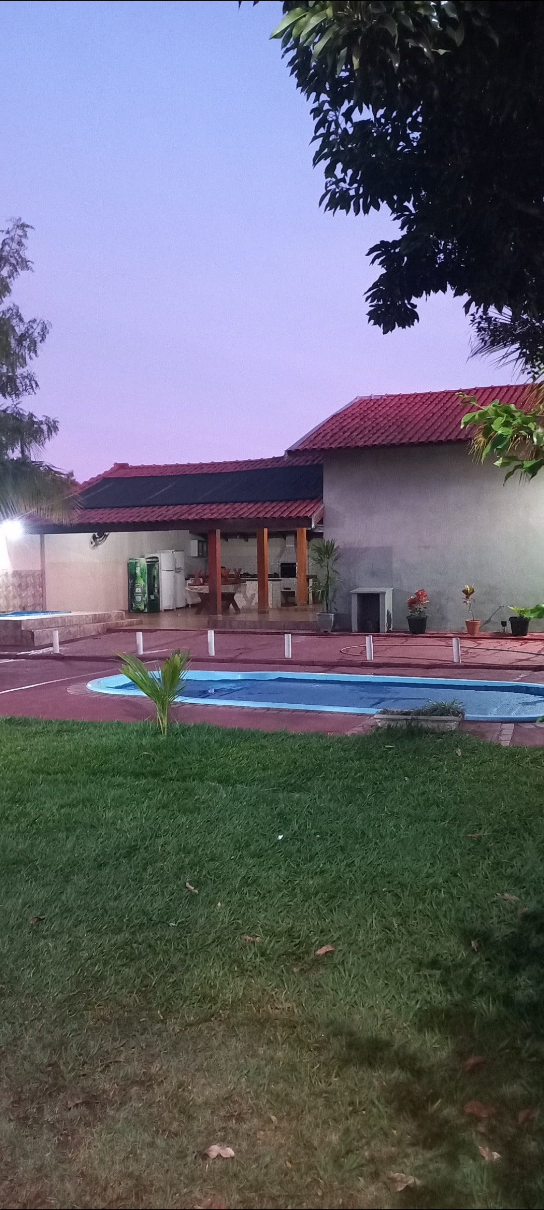 Casa com área de lazer. A casa possui 1 quarto com duas camas de casal e um colchão, guarda roupa e ar condicionado. Possui um amplo banheiro interno e 2 banheiros externos tipo "masculino e feminino". A sala conta com aparelho de tv e sofá retrátil e reclinável. A casa fornece ainda internet Wi-Fi. Área externa com mesa e cadeiras, churrasqueira e piscina limpa exclusiva para recebê-los.
