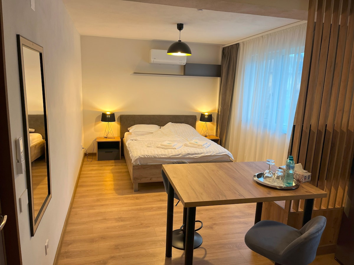 Our cozy & modern 2-rooms apart. is located in the peaceful Hanul Doctorului - Panoramic area. Perfectly furnished and fully equipped, it features a central heating system, AC, TV, free WiFi, double bed and an extendable sofa to ensure a comfortable stay. The flat is very close to the airport and offers excellent access to local attractions. It's just 5 min from Electroputere Mall, 10min to the city center (Xmas Market), 10 min to Parcul Romanescu (Easter Fair), less than 500m from a bus stop.