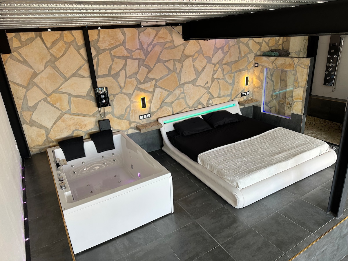 Exclusivo Loft de lujo de 45 metros, diseñado a dos alturas, con vistas al mar. Ideal para experiencias románticas en pareja. Cama king, jacuzzi para dos personas con cromoterapia y equipo de sonido bluetooth, cocina y baños privados. La experiencia para parejas en un espacio concebido para el disfrute personal, con cama king junto al jacuzzi frontal al mar, cromoterapia integrada en la habitación y música de ambiente, hará que su estancia sea inolvidable.