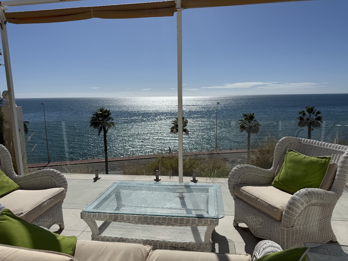 Villa in Mijas Costa, one minute from the beach with stunning sea views from all over. We offer the best experience for your dream vacation. Ideal for your family and friends to have the comfort and space they deserve, with unparalleled privacy and security. Our Villa has a privileged location in an urbanization with a common swimming pool, tennis court, cafeteria and private parking. Every element that makes the Costa del Sol unique brought together in one home.