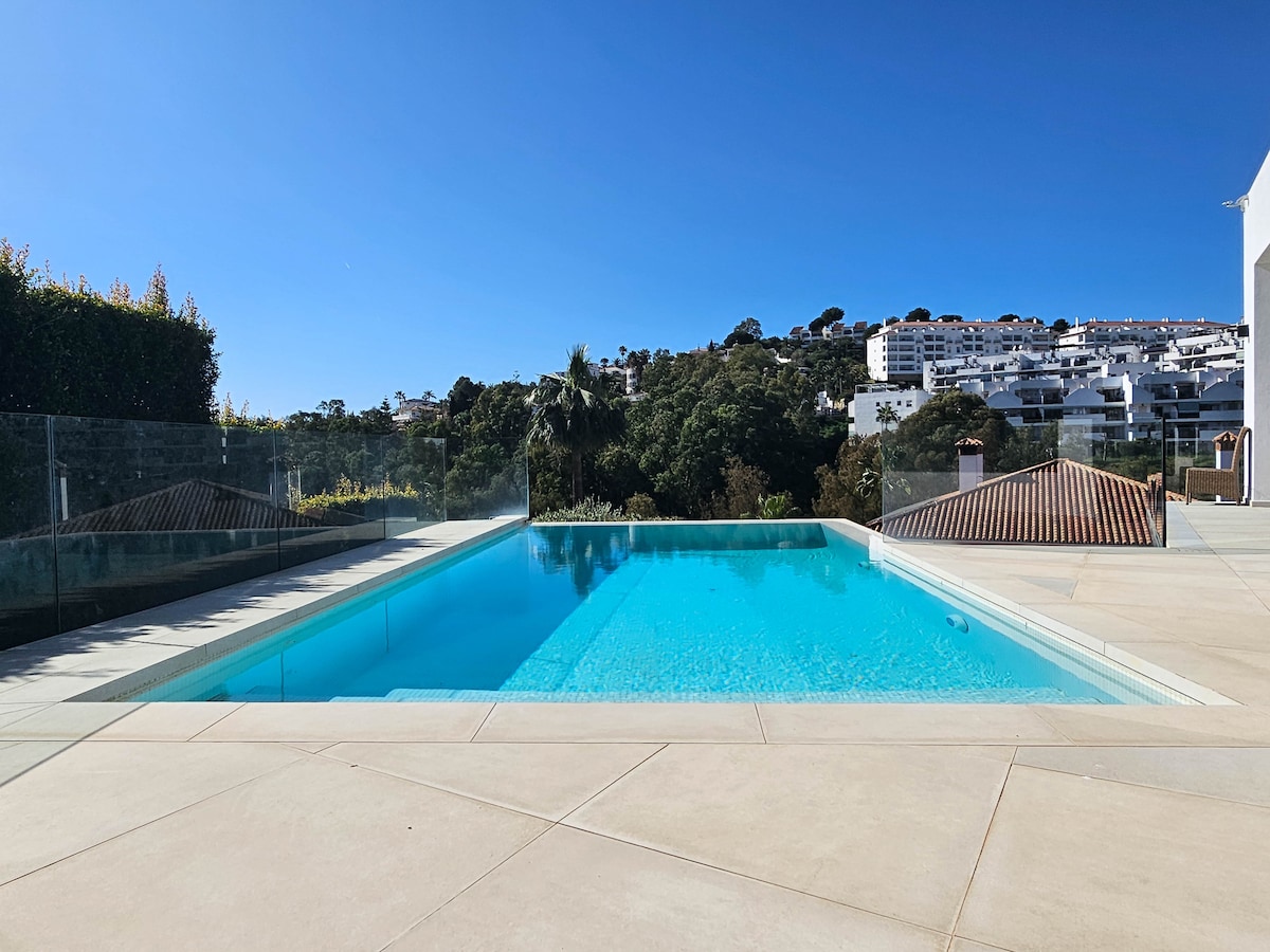 Casa Del Mirador is a Luxurious Penthouse style Villa with a Private Pool & Hot Tub. A truly stunning location that provides Panoramic views of the valleys and mountains of Sierra Blanca in Marbella and Sierra de Mijas. It has Super Fast Starlink Internet and is walking distance to the restaurants, bars, cafes, shops, spa and gyms. Only a 20 minute drive to the coast of Marbella and Fuengirola, and Malaga airport. Or only a short drive to the Golf Courses, Lakes, Forest hikes and walks.