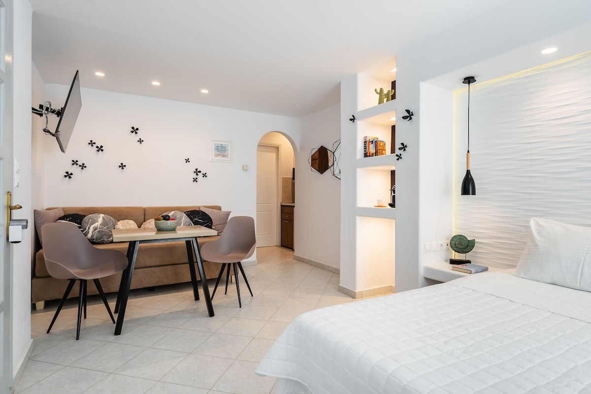 Welcome to Flat Poseidon, part of Enosis Apartments, ideally located just steps away from the long sandy beach of Agia Anna. This bright studio offers a private balcony with a hot tub and a stunning panoramic sea view. Enjoy breathtaking sunsets, the refreshing Aegean breeze, and the island sunshine — all from the comfort of your own space. Designed in traditional Cycladic style, Flat Poseidon invites you to relax and feel the true spirit of Naxos.