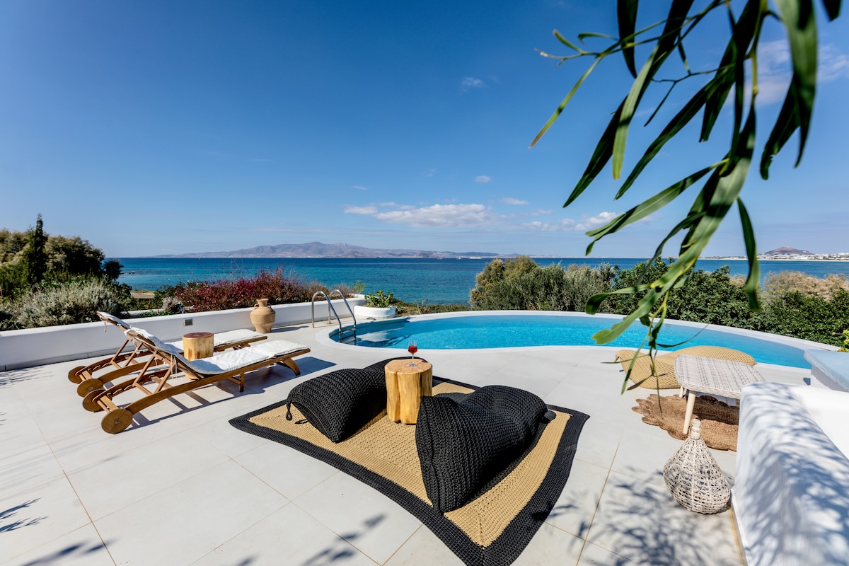 This villa provides you with everything you need and so much more. A delightful view from the spacious roofed patio, as well as a private beach with umbrellas and sunbeds. The blue sea at your feet. The blue sky in your eyes. The unique landscape in your heart! The luxury of Villa BLUE is the one you treat yourself with for a unique escape from reality.