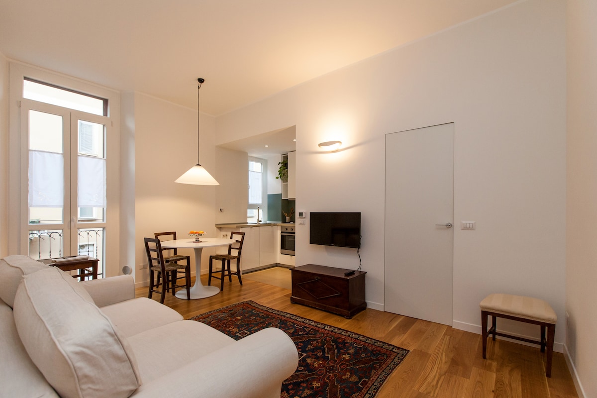 Wake up to the morning light in a historic building in Piazza Giovine Italia. High ceilings create a sense of space, while the living room, with wood paneling and a panoramic balcony, invites you to relax. The modern kitchen and dining area are perfect for intimate dinners, while the bedroom and spacious bathroom offer a serene retreat. A charming oasis where history and comfort meet, for an unforgettable stay.