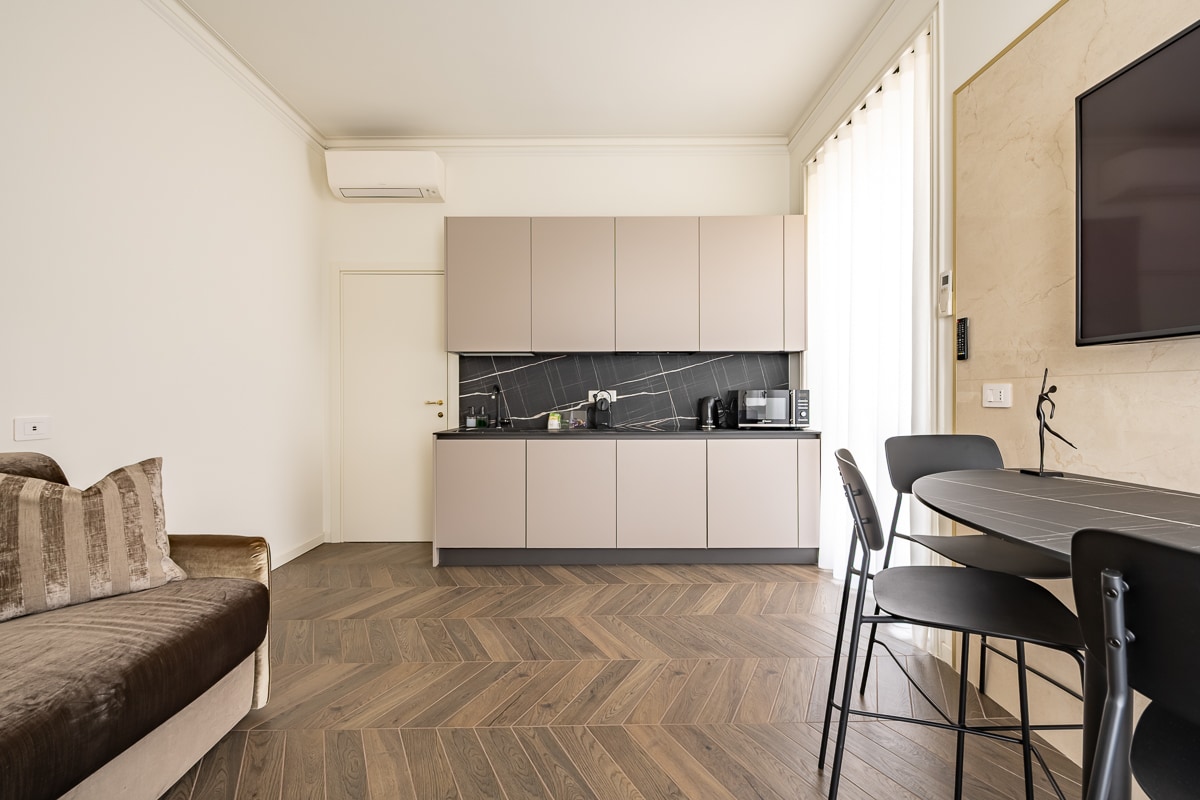 Wake up to the morning light in a historic building in Piazza Giovine Italia. High ceilings create a sense of space, while the living room, with wood paneling and a panoramic balcony, invites you to relax. The modern kitchen and dining area are perfect for intimate dinners, while the bedroom and spacious bathroom offer a serene retreat. A charming oasis where history and comfort meet, for an unforgettable stay.