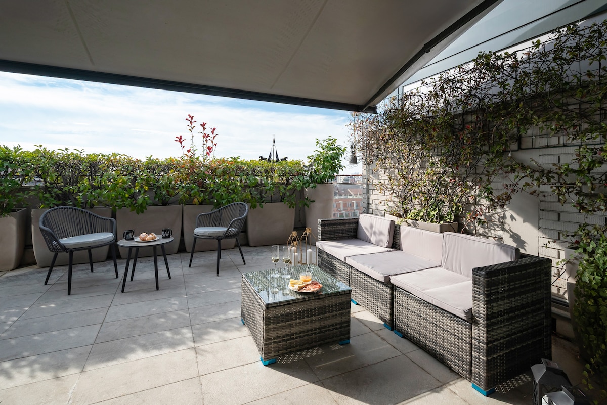 Splendido attico con terrazza privata con cucina esterna e vasca Jacuzzi, all'interno di un lussuoso complesso residenziale dotato di piscina, gym, SPA e parcheggio privato. L'appartamento modernissimo e dotato di tutti i confort, è composto da soggiorno, zona pranzo con cucina a vista, due camere da letto matrimoniali e due bagni con doccia, ed è arredato con mobili di design e quadri di pop art. La terrazza ad uso esclusivo è dotata di solarium, cucina all'aperto, vasca Jacuzzi e zona pranzo.