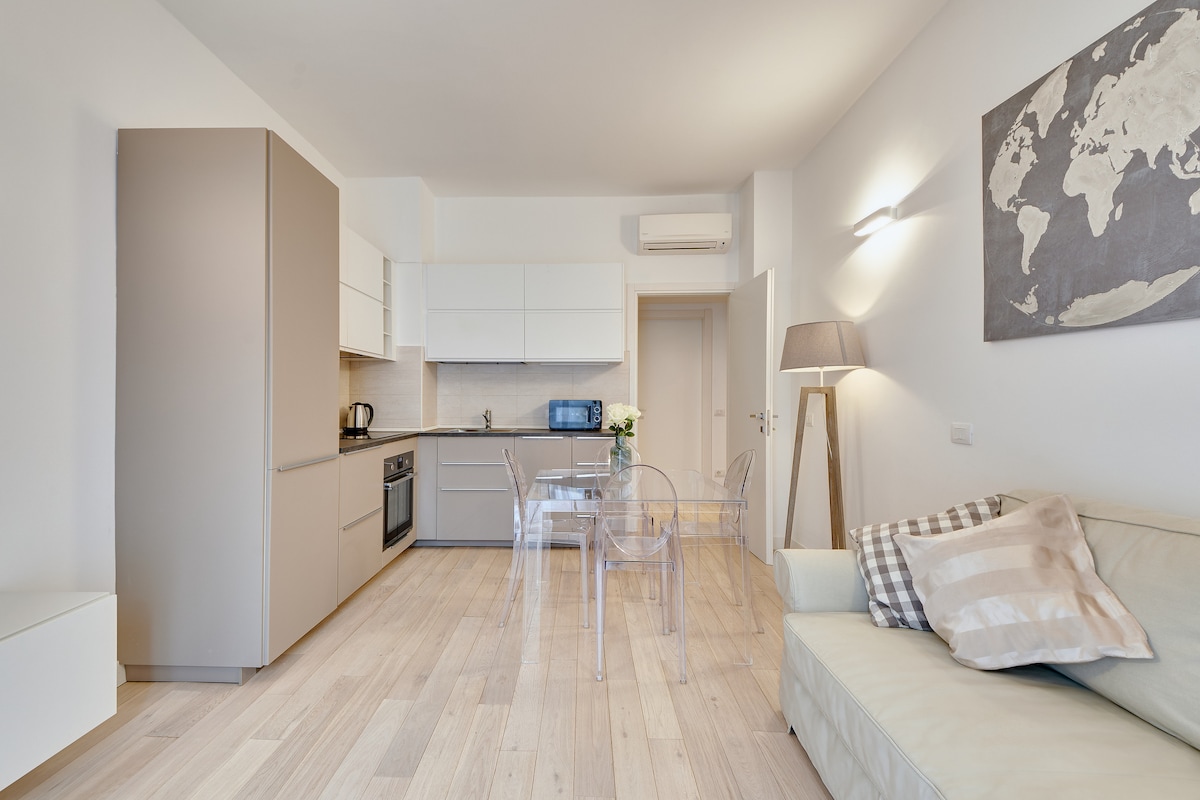 Symphony is a modern and bright apartment, designed to offer a comfortable and functional stay in the heart of Milan. The well-organized and thoughtfully designed spaces create a welcoming and relaxing atmosphere, perfect for unwinding after a day in the city and feeling at home right away. Located just a 2-minute walk from Central Station, it offers easy access to the Duomo, city center, and airports, making it ideal for those seeking convenience when getting around.
