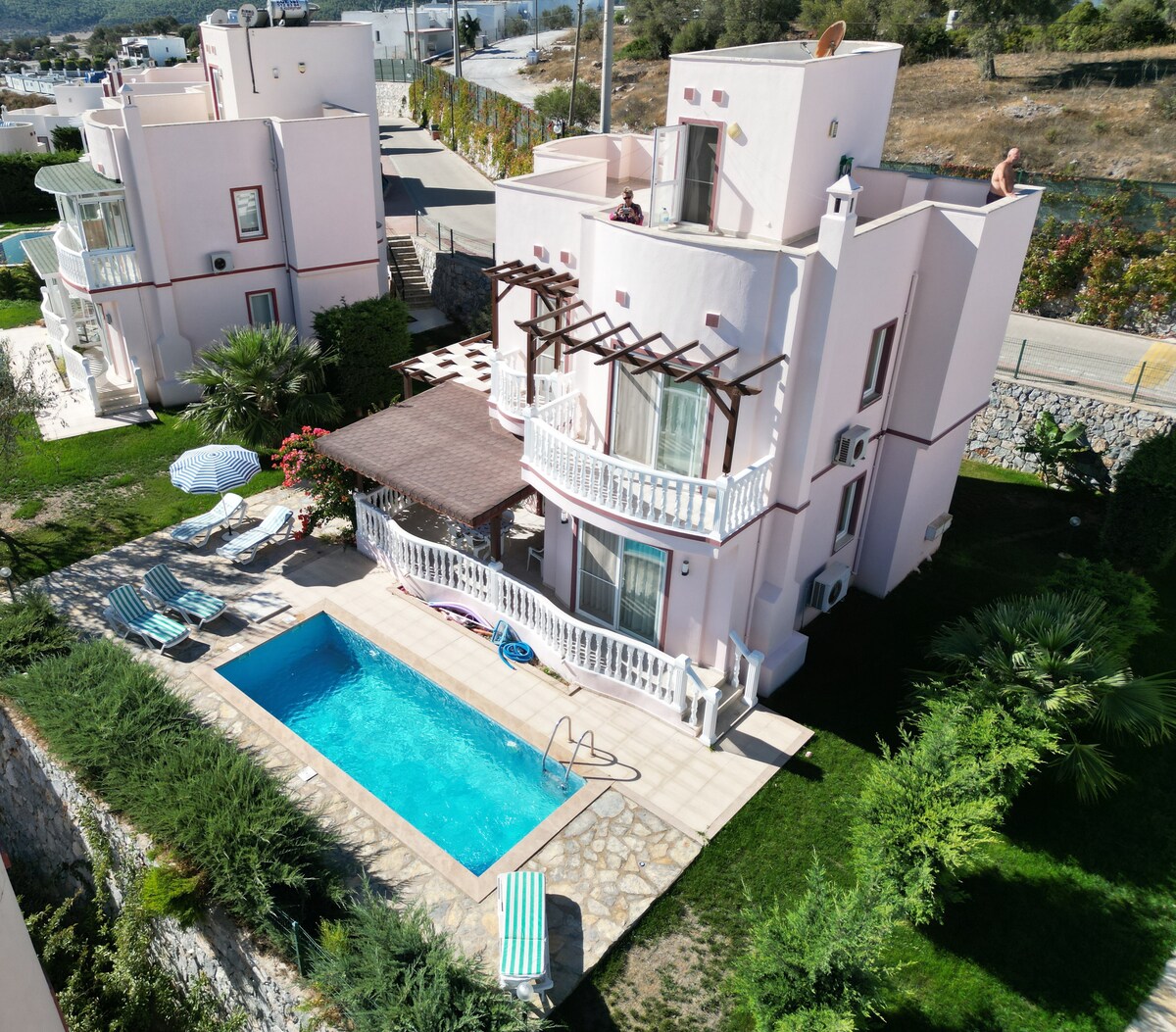 If you are looking for home comfort, silence, peace, pool, weekly room care and being in the nature our house is appropriate for those. While staying in serenity you are only 15 minutes away to the famous Bodrum entertainment life, only 6-7 minutes away to the best clear nearby beaches by car or you can even walk to the sea side in just 4 minutes.