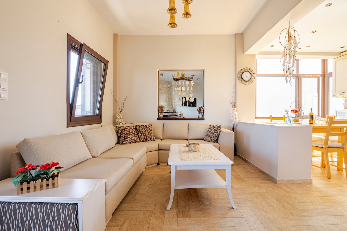 Σε ένα μικρό χωριό , που απέχει μόλις μισή ώρα από το αεροδρόμιο Ηρακλείου και μυρίζει θάλασσα και θυμάρι , φτιάξαμε ένα διαμέρισμα φιλικό προς το περιβάλλον με άρωμα νησιού και χρώμα ελληνικό. In a little village, which is only a half hour away from the airport of Heraklion and it <<smells>> sea and thyme, we created an environmentally friendly apartment with flavor of an island and Greek color.