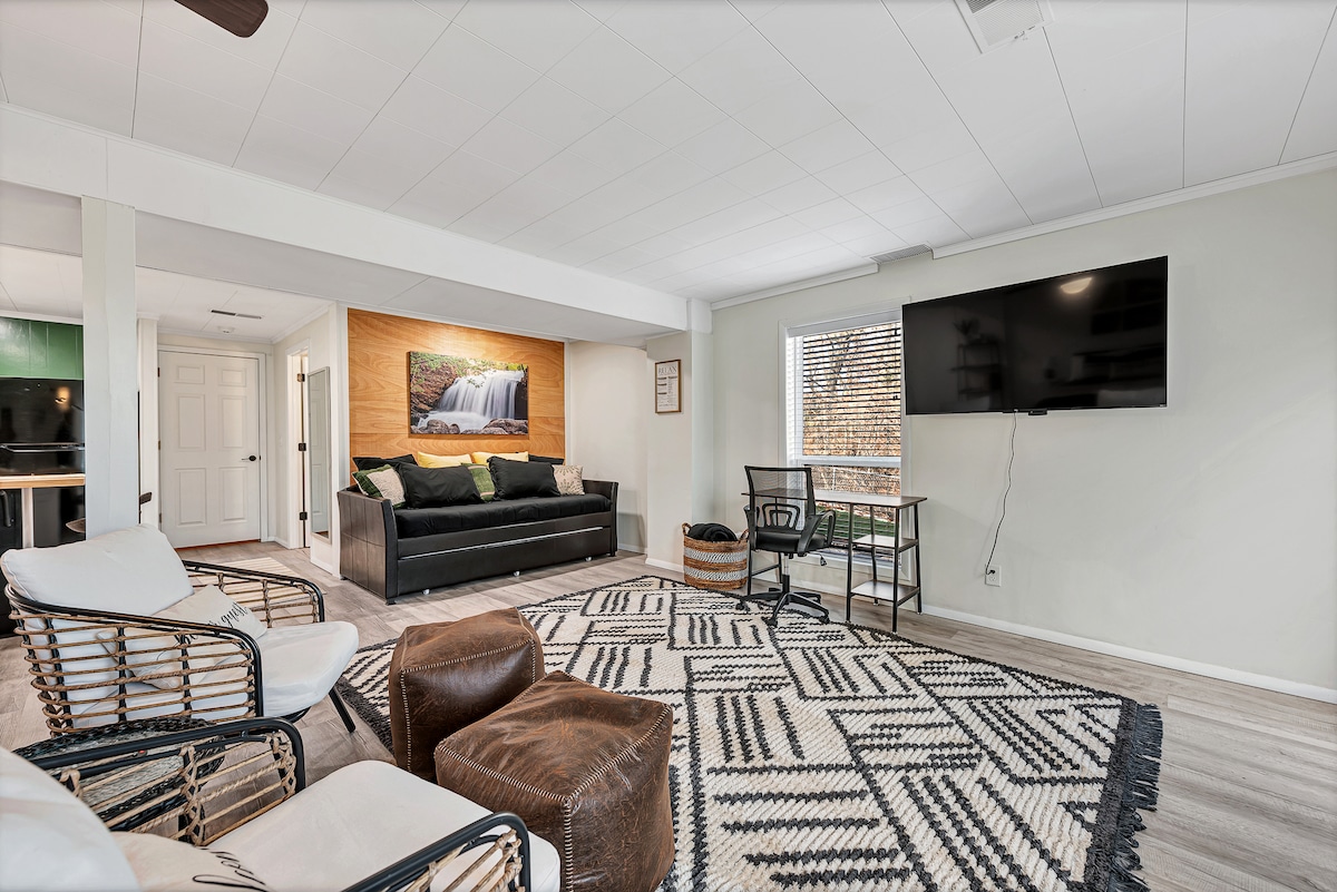 The Treehouse Bungalow was personally renovated and designed by your hosts, Steve and M over the last year. All of the spaces are brand new and exude comfort & peace. From the cozy living room with electric fire place to the spacious deck facing the woods. You will find several, separate areas to make your own. We encourage you to take a break in the soaker tub or grab a book and lounge in the king size bed master. The bike trails, golf, and lakes all around. Come visit NWA and be our guest!
