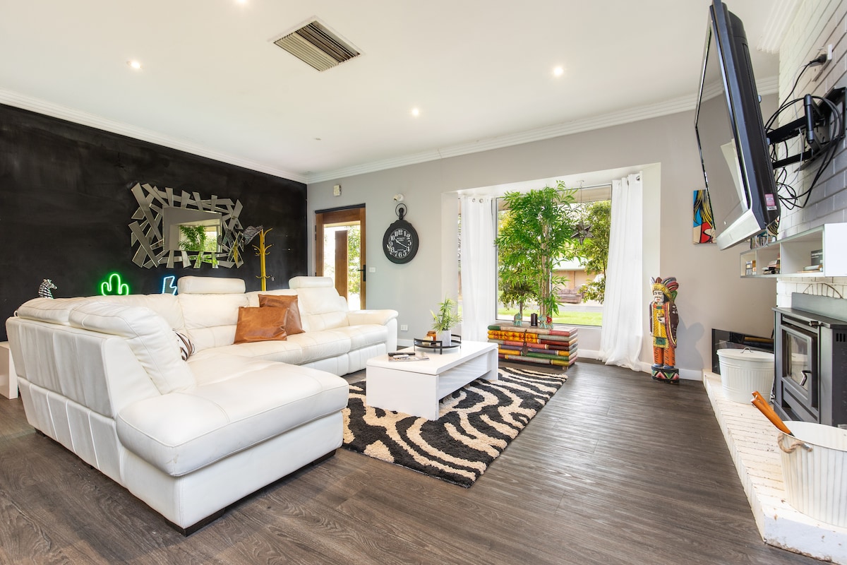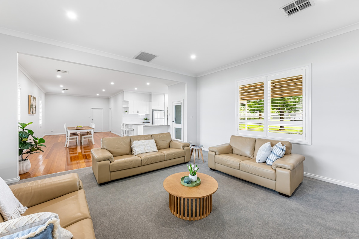 HEATED POOL -Enjoy a stylish experience. Family-friendly retreat with a pristine in-ground heated pool and expansive outdoor entertaining area. Just minutes from a beautiful massive fenced playground for kids (Park for Play ) , and a short drive to the river, cafes, golf course and supermarkets. Perfect for relaxing getaways, gatherings, and easy everyday convenience at this centrally located place. We also have two fold out beds if you have extra guests. Pets Allowed, Fully fenced home