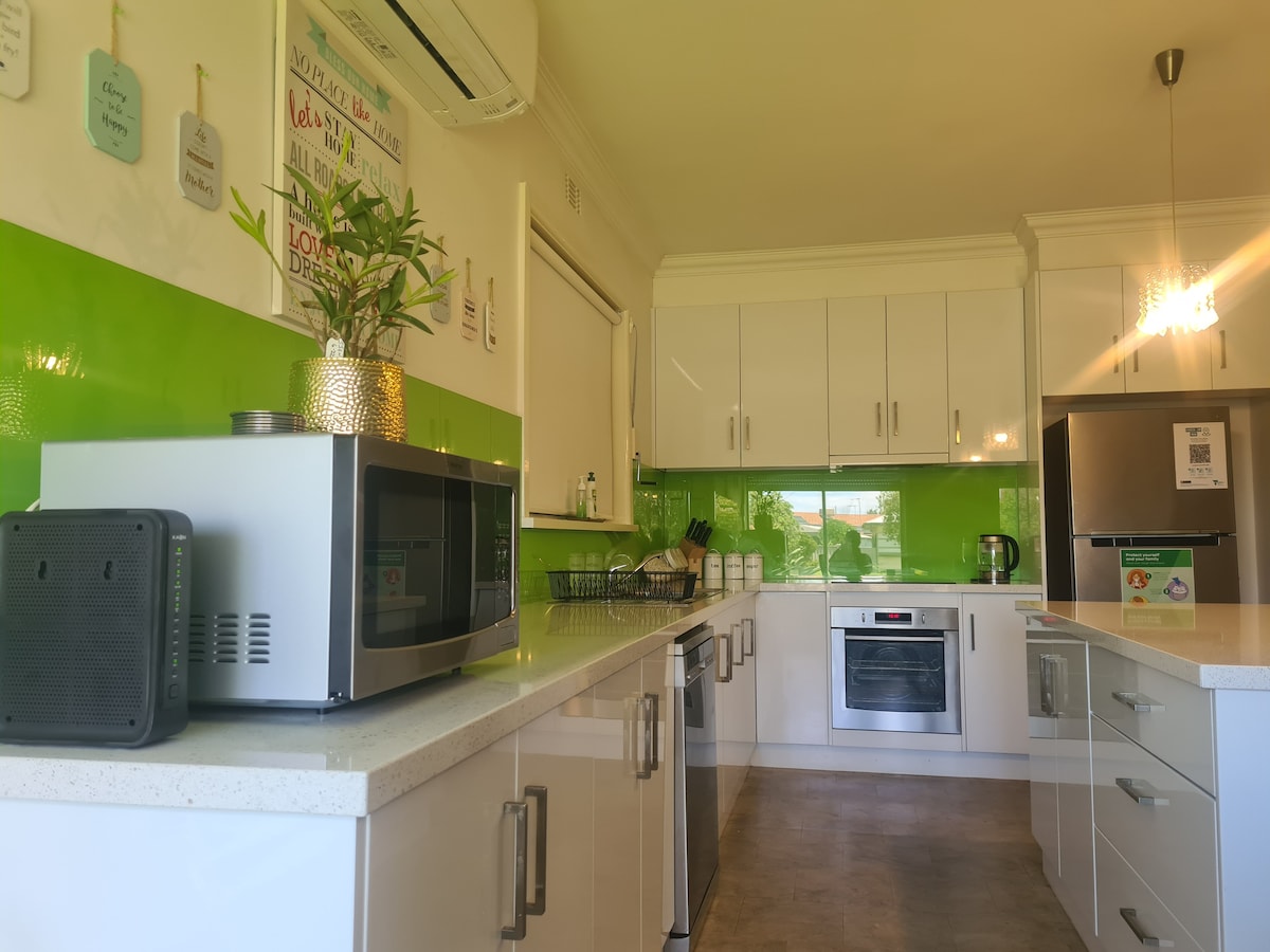 Peaceful central location on a no through road and situated directly opposite a beautiful park with large open grass areas. The house has been restored to preserve its mid century charm with modern features included New split system aircon in each bedroom & living-kitchen area. 55 inch smart tv, cook top, oven, fridge, microwave, washing machine, dish washer, coffee machine & furnishings. Unlimited wifi. Easy walk to CBD, Murray River, tourism, pool, library, hospitals & golf