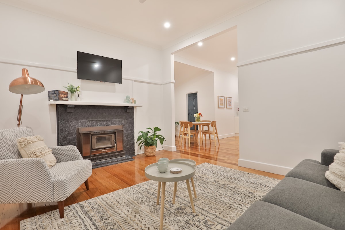 Take it easy at this unique getaway. Discover our newly renovated three-bedroom haven, thoughtfully styled with timeless Art Deco charm. Unwind in the beautifully crafted outdoor bath house,a unique space to relax. Nestled in a quiet street, this home offers peace and privacy while still being close to everything you need. New ducted reverse cycle air conditioning keeps you comfortable all year round. With ceiling fans in all bedrooms. Your perfect getaway awaits -relax and enjoy your stay.