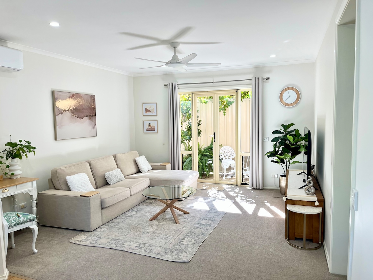 Private guest house situated by Mildura's riverfront, Arts Centre, and close to the CBD and sleeps two in a comfortable queen bed. It features split system air conditioning, walk-in robe, Wi-Fi, laundry, and kitchen. Enjoy the warmth of the stylish light-filled space, garden, chickens, and dog, Lil. A relaxing stay in sunny Mildura awaits. Complimentary milk, tea, coffee, fresh eggs, and toiletries are provided too. 😀