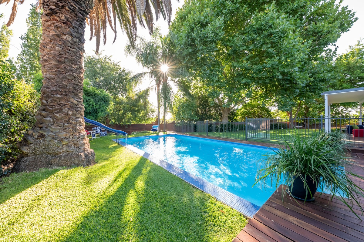 HEATED POOL -Enjoy a stylish experience. Family-friendly retreat with a pristine in-ground heated pool and expansive outdoor entertaining area. Just minutes from a beautiful massive fenced playground for kids (Park for Play ) , and a short drive to the river, cafes, golf course and supermarkets. Perfect for relaxing getaways, gatherings, and easy everyday convenience at this centrally located place. We also have two fold out beds if you have extra guests. Pets Allowed, Fully fenced home