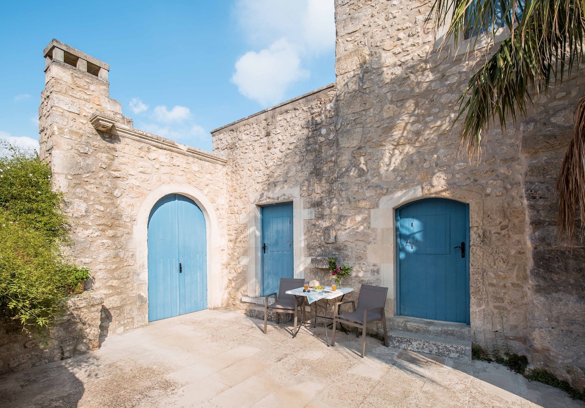 A fully renovated, stonebuilt compound built on top of three ancient greek grottos. It used to be a Venetian olive press factory. Now it's a contemporary holiday home with two pools (indoor and outdoor) and an organic vegetable and local fruit garden