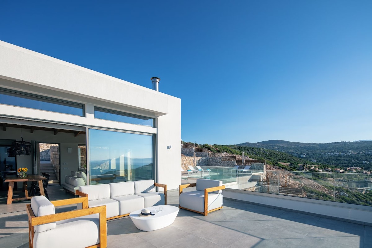 Villa Santa Irini 3 – Modern Elegance with Unmatched Sea Views Nestled in the serene hills near Agia Irini Monastery in Rethymno, Villa Santa Irini 3 is part of the exclusive Santa Irini Villas complex. This modern, luxury villa offers breathtaking, unobstructed views of the Cretan Sea and is the perfect retreat for families or small groups seeking privacy, comfort, and proximity to both nature and city life.
