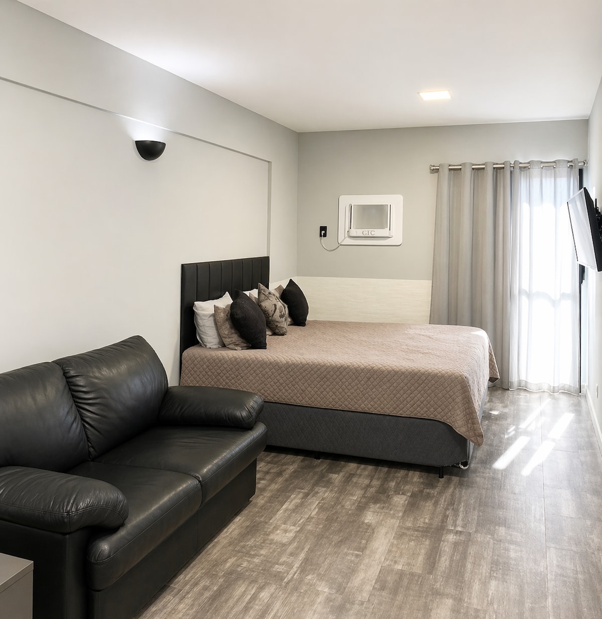 Apartamento mobiliado, apenas 230 metros da praia, menos de 3 minutos a pé. Roupa de cama, toalhas, ar condicionado, TV a cabo, wi-fi, cofre digital, secador de cabelo. Acomoda confortavelmente 4 pessoas, com uma cama de casal no quarto e um sofá cama na sala. Para maior conforto, o Flat conta com recepção 24 horas facilitando o check-in ou check-out, excelente café da manhã (pago a parte), piscina, academia e limpeza diária, exceto domingos e feriados.
