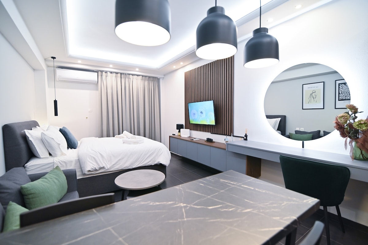 Μοντέρνος και λειτουργικός χώρος με minimal αισθητική. Διαθέτει άνετο τραπέζι με σκαμπό, ανοιχτή ντουλάπα και 100 Mbps γρήγορο internet. Ιδανικός για ζευγάρια ή solo ταξιδιώτες που αναζητούν άνεση, κομψότητα και εργασία εξ αποστάσεως. Σε κεντρικό σημείο με εύκολη πρόσβαση σε όλα!