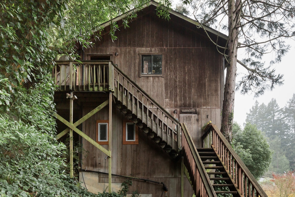 Great for a vacation, work-from-home alternative or staycation. One room "tree house" studio in a redwood grove. Large, spacious room with 2 twin beds, shower, fridge, microwave oven, coffee maker, Netflix/Amazon Prime. 15 min "fairy-tale" walk to downtown Mill Valley. Close to hiking trails and Muir Woods yet only 30 min from San Francisco.