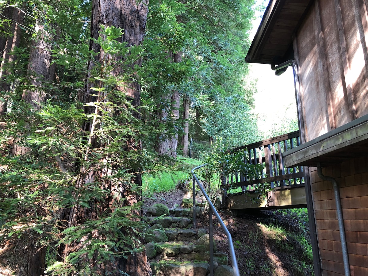 Large charming room with separate entrance, private bathroom & your own deck in stunning redwood grove on the famous Dipsea steps. Right out your door are trails to Muir Woods and Stinson Beach. Downtown Mill Valley’s fabulous cafes, restaurants, shops and bars are a ten minute stroll down the Dipsea steps (along with a superb music scene). Includes on-site parking, cozy queen bed, laundry, wifi, smart TV, safe storage, coffee/tea, and mini-fridge in an absolutely beautiful, serene setting.