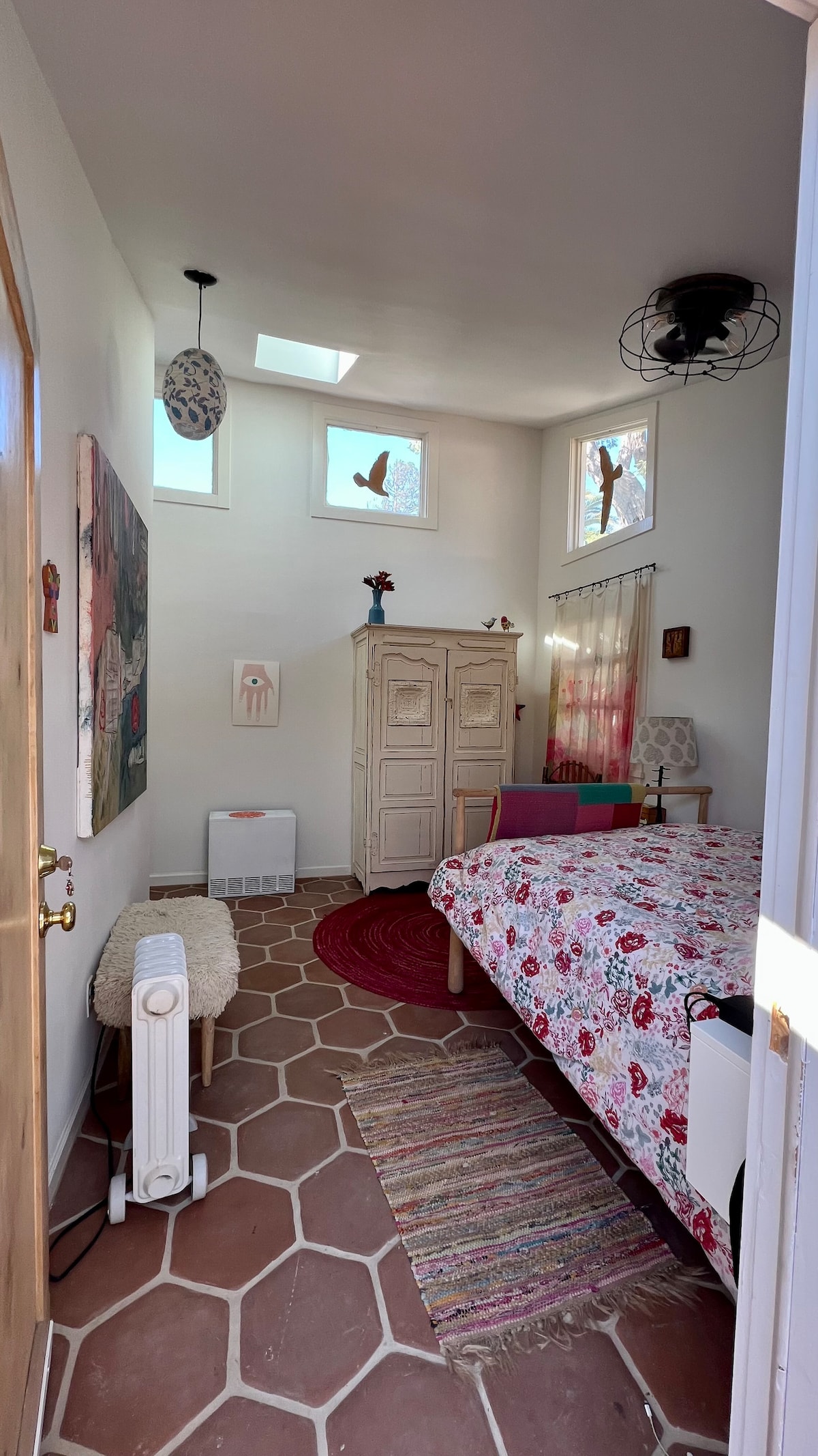 Welcome to this unique and tranquil getaway. Old world charm meets boho in this wonderful studio above garage with separate entrance. A spacious yet cozy space with vaulted ceilings makes it feel really special. The wood burner (non op) adds a unique element and ambience to the room. The kitchenette is ideal for morning coffee or warming food. The lookout deck is a gem and a lovely private spot. Step outside and you are practically in the hills already. Interior staircase up to studio
