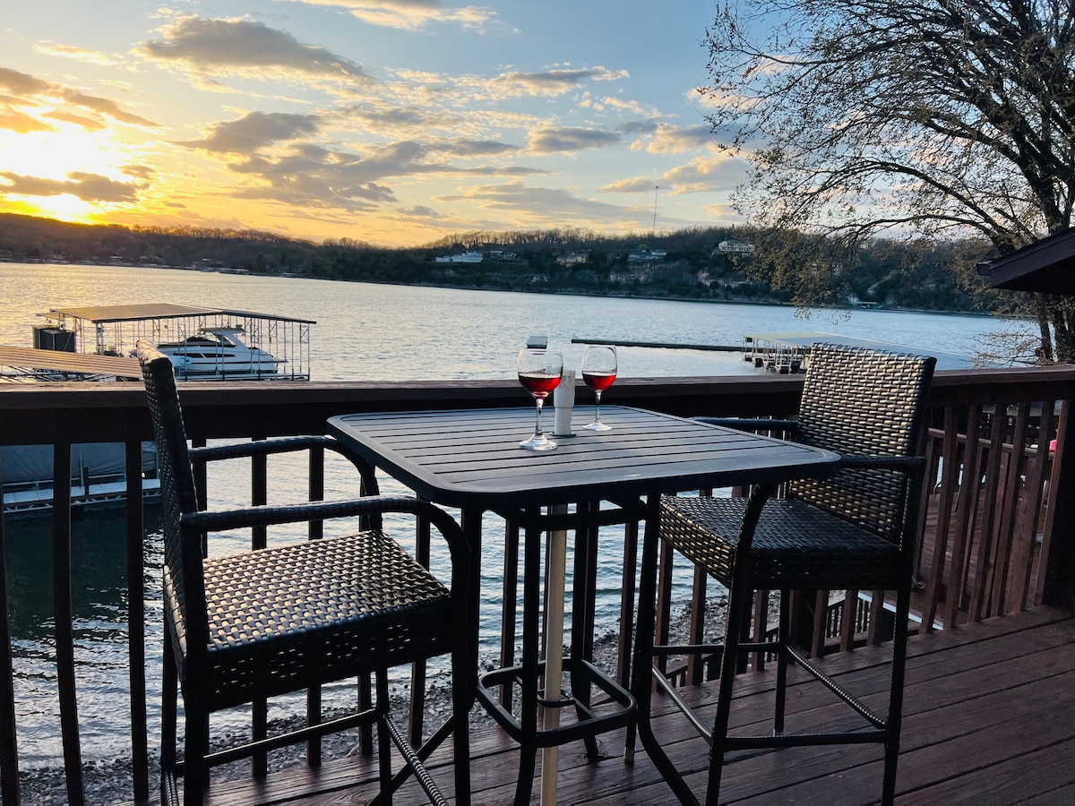 Entire lake house ready for your next lake retreat with family or friends. Spacious living area including outdoor deck space with a private dock and kayaks for use! Watch the sunset on the dock while grilling out or next to the gas fire pit. Cozy up next to the wood burning fireplace. **NEW LOWE Tritoon BOAT RENTAL option or space to side dock your boat. Close to the strip, grocery stores, and restaurants. Mini golf, go-karts, and a winery are also nearby. Perfect for a weekend or long get away.