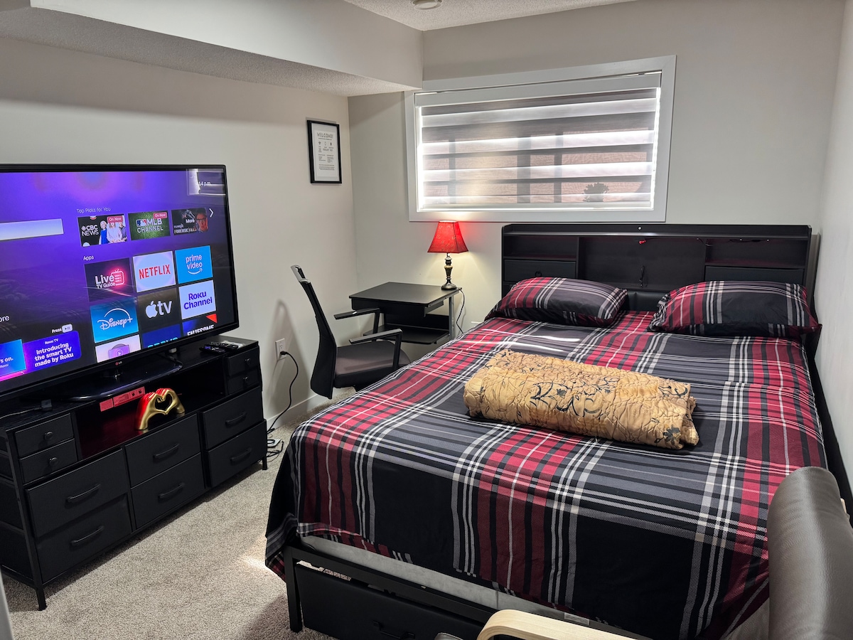 Welcome and relax in this stylish, comfy and cozy brand new basement suite in Southfork Leduc. This beautiful suite with a private smart keyless entrance. It is equipped with brand new appliances, 2 ROKU TVs, WiFi, dedicated work station. Free onsite parking to make your stay an enjoyable one, suitable for both personal and business trip. It’s Located 5 mins to the grocery store, 11 mins to Edmonton Int'l Airport, 7mins to LRC and 14 mins to Edmonton Premium Outlet mall for your retail shopping