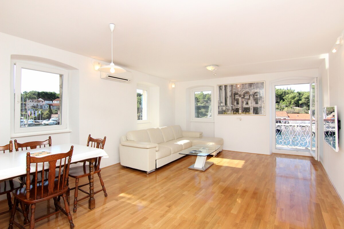 Enjoy the best experience of Split old town in Riva View Apartment. Perfectly located in the middle of Riva on the 1st floor, you will enjoy the beautiful view on the islands from your balcony. The apartment has been completely renovated to reveal the authenticity of the Diocletian Palace stone walls and provide the maximum comfort during your stay. You will find the closest public paid Parking just few hundred meters from the apartment and the Ferry port is a 5 minutes walk away.