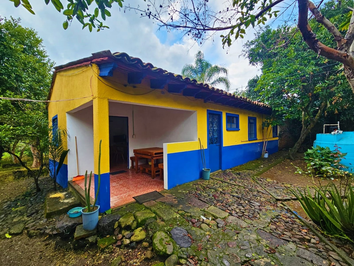 Disfruta en medio de la naturaleza en el bosque. Por la mañana podrás escuchar el canto de los pájaros con un café, aprovechar el tiempo para conectar con tu tribu y gozar el día como pocas veces se puede. La cabaña está ubicada a 15 min del centro de Tepoztlán en vehículo o a 5 min caminando al transporte que te llevará al centro. También podrás evitar todo el tráfico ya que no necesitas cruzar el centro. Muy conveniente en puentes y fines. La propiedad está cercada. La vegetación varía.