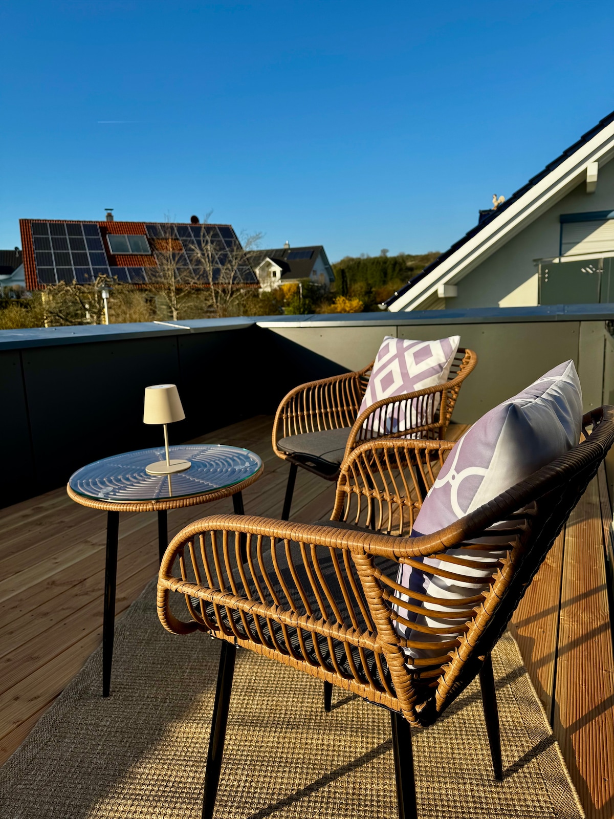 Großzügige und hochwertig ausgestattete Ferienwohnung mit 3 Schlafzimmer und 2 Bädern. Helles, sonniges Wohnzimmer mit fussbodentiefen Panorama-Schiebefenster, Parkettboden und gemütlichen Kaminofen Große hochwertige, voll ausgestattete Wohnküche. Großer Balkon mit Blick ins Grüne. Garage für Fahrräder und hauseigener Parkplatz im Hof.