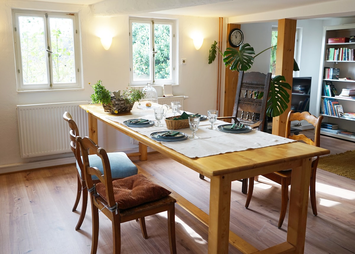 Meine Unterkunft liegt eine Stunde südlich von Frankfurt, mitten in der Natur. Gut geeignet für Gruppen und Familien die Natur suchen. Es gibt ein wunderschönes Aussengelände mit gemütlichen Sitzgruppen, Spielwiese, Lagerfeuerplatz, eine große überdachte Sommerküche, Gemüsegarten, Tischtennisplatte, Werkbank für Kinder, eine Töpferwerkstatt zum selbst Töpfern, ein Klavier in der 45 qm großen Wohnküche. Hervorragendes Wohnklima durch Holz/Lehmbauweise.