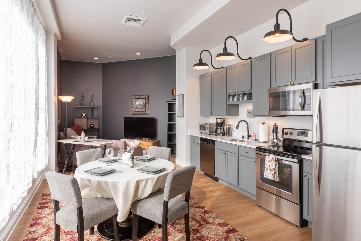 Welcome to your stylish Milwaukee retreat! This large corner studio loft blends historic Cream City charm with modern comfort. Soaring 15-ft ceilings, exposed brick, and oversized windows create a bright, open space. Enjoy a spacious king bed, fully stocked kitchen, and free off-street parking — rare in this neighborhood. Walk to the Third Ward, Walker’s Point, and Milwaukee’s best restaurants, breweries, shops, and the vibrant riverfront. Perfect for both work and play.