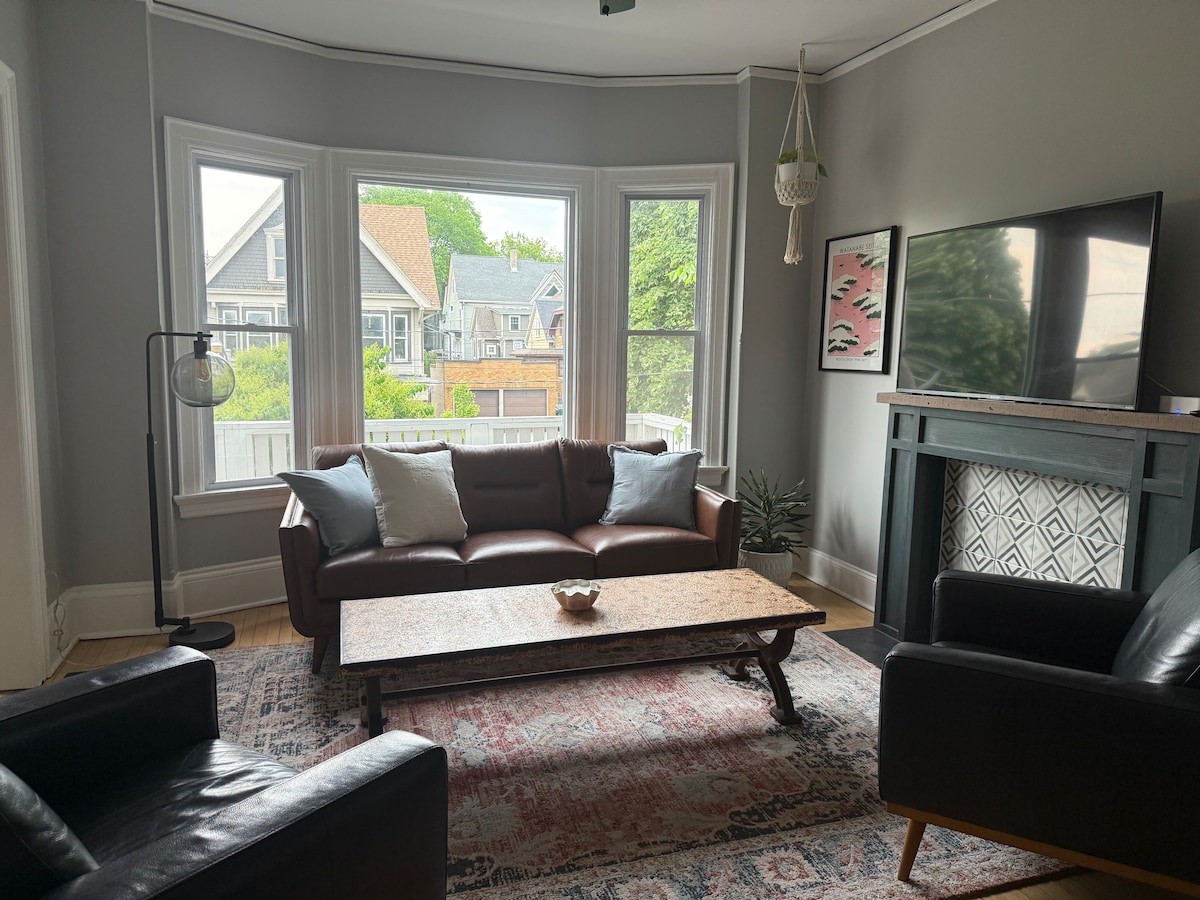 Just down the road from Lake Michigan, this charming duplex upper is the perfect space for a relaxing getaway. After a day of shopping, eating good food, and exploring Milwaukee, look forward to kicking back in the cozy living room, or on the patio. This duplex has 2 bedrooms; a King bed master, and one bedroom with two Twins. There is one charming bathroom with a bathtub. Well stocked kitchen, and plenty of backyard space. The lower tenant is respectful of guests.