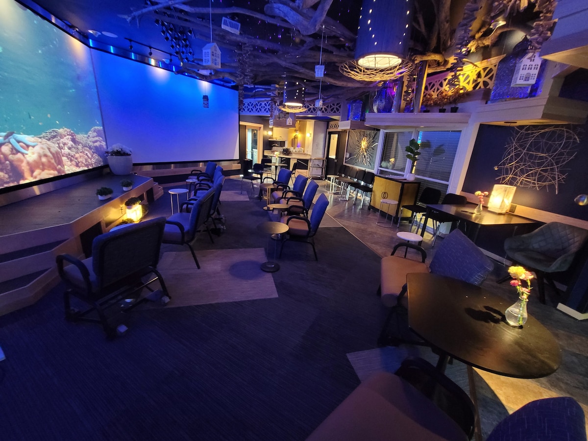 $595/4 HRS NOT A BEDRM...but A STUNNING PARTY RM, w/ possibility to use huge 60ft × 25ft COVERED PATIO so rain-or-shine, indoor or out, from 10 person meeting,to a 40+- dinner theatre, or 77 seat conventional padded seating rows. Use raised stage (or expand stage bigger for a band), this vertitile room (w/lited stars ceiling) is THE answer for small/medium gatherings & celebrations! Baby grand piano and 9'×16' movie screen available. 11 bedrms,(including 2 aptmts, for 23max available separate.