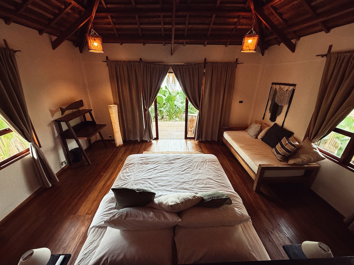 The bright room with terrace overlooks a tropical garden. You may enjoy the ocean and horizon with sunset from our garden roof deck with a romantic dinner. Pristine beaches are minutes from our location. The booking includes complimentary breakfast. Local dishes and seafood dinners are prepared by our Chef upon request . You may expect a unique island experience in our sustainable boutique property with just 9 rooms/apartments. We operate a backup generator.