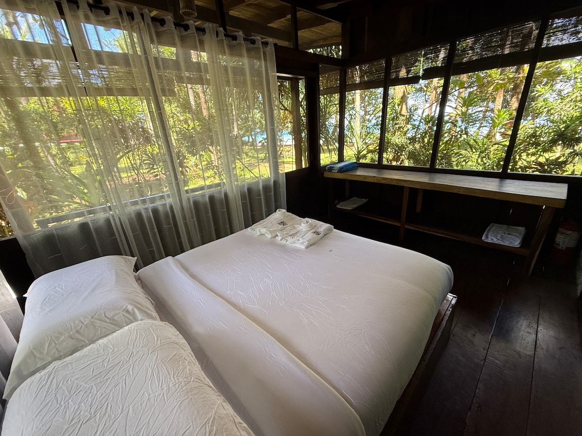 Welcome to our tranquil bamboo studio cabins nestled directly on the beachfront. Each cabin features a full bathroom, a luxurious king-sized bed, air conditioning for your comfort, a TV for entertainment, and fast, reliable Starlink internet to stay connected. Enjoy the convenience of a mini-fridge, a cozy lounge area, and a dining space, all while immersing yourself in the serene beauty of the beach just steps away. Experience the perfect natural paradise for an unforgettable getaway!