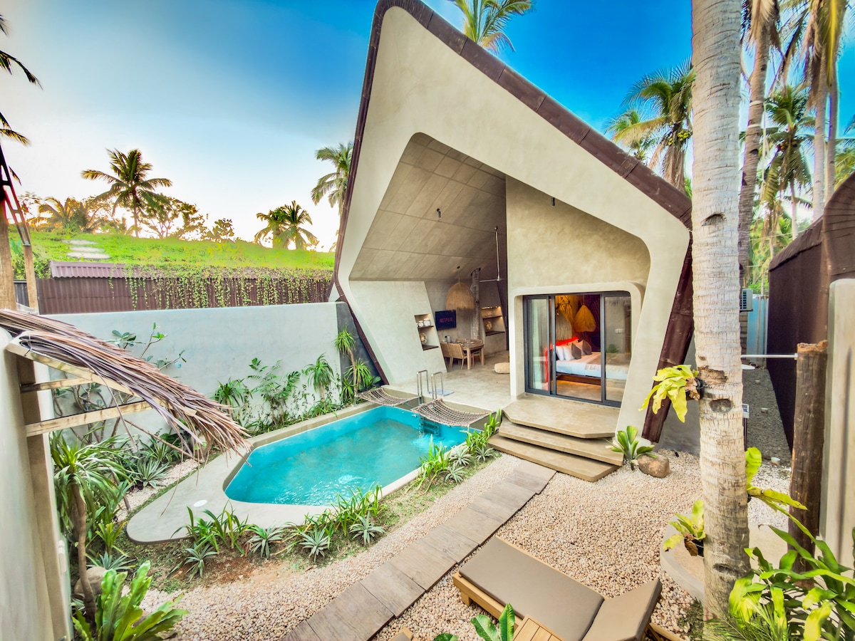 Villa Alto is a private pool villa in an eco-village paradise—remote and tranquil yet central; just minutes drive from El Nido town, beaches, and the airport. It features an iconic high-peak design, open living space with theatre kitchen and bar, and a private garden and pool that flow into the living area, with hammocks throughout. One bedroom plus open loft bed and sofa bed sleep up to 5 when fully used, ideal for couples, families, or friends comfortable sharing.