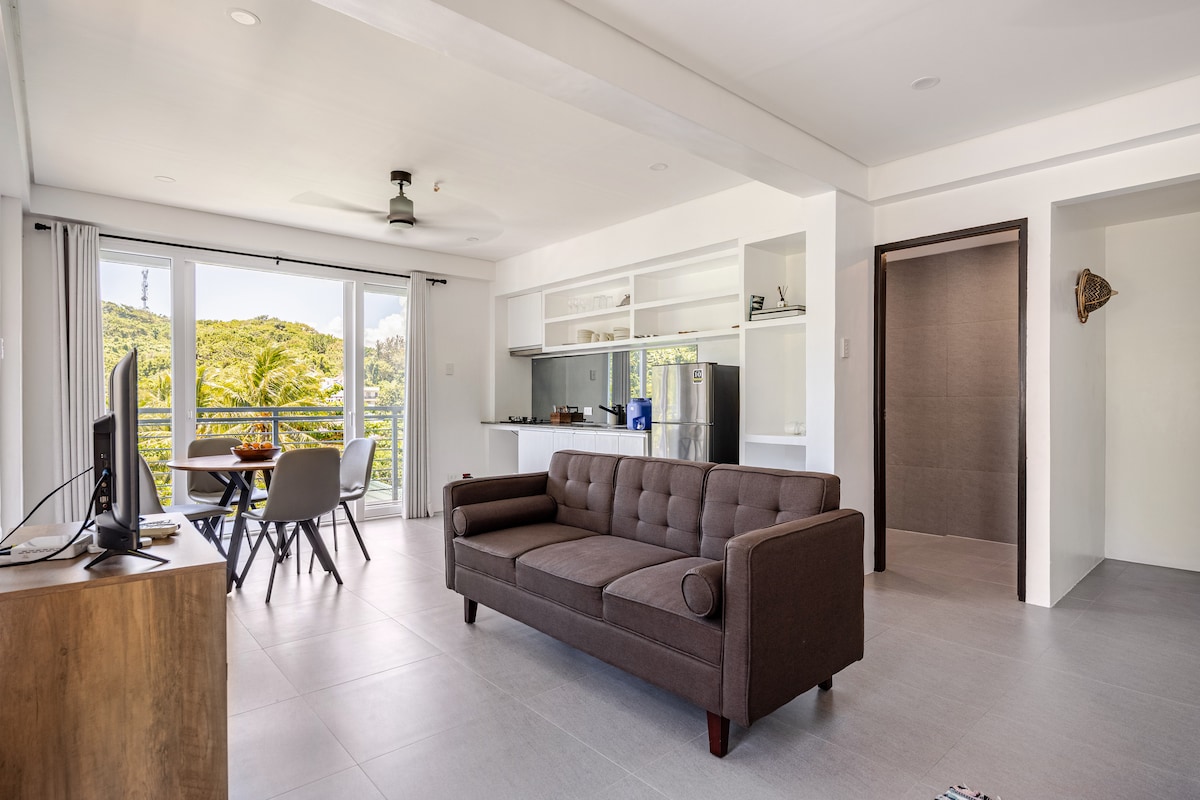 Kick back and relax in this calm, stylish studio apartment with a beautiful hill view. The space features two double-sized beds, comfortably accommodating up to four guests (depending on size). Enjoy the convenience of a basic kitchenette and unwind in the bathtub for a soothing end to your day. Note: Located on 2nd floor unit with stairs only no elevator on the building. The building is bit far from the lobby and main road going up and down is not suitable for senior citizen.