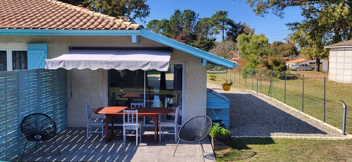 Separates Ferienhaus - ideal für 2 Personen! - 600m² Garten - komplett eingezäunt - hundefreundlich ! -ruhig gelegen im "Forêt de Landes", 11 km vom Strand. - Wohn-/Schlafzimmer mit Schlafsofa und TV - voll ausgestattete Wohnküche mit Kaminofen - kleines Bad. -Terrasse vorm Haus fürs Frühstück in der Morgensonne - Wiese mit Pavillon hinter dem Haus bietet Privatsphäre zum Chillen - genug Freiraum auch für Ihre Vierbeiner. (Für zusätzliche Personen gibt es Gästeliegen !)