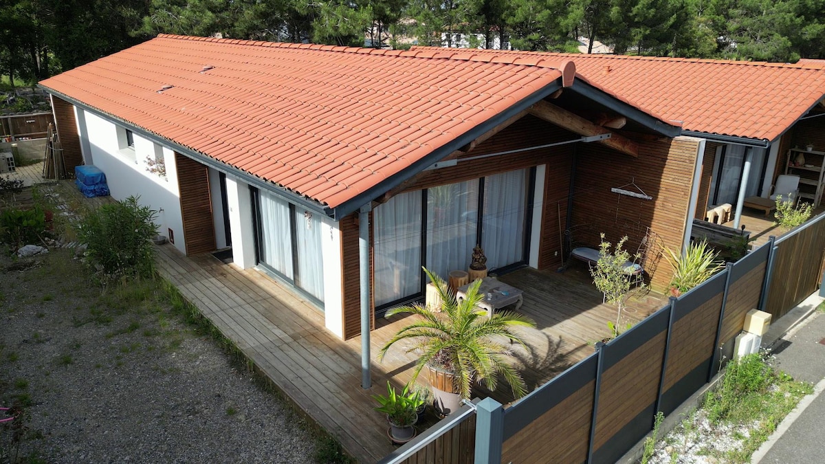 Maison totalement indépendante de 40m2 située en retrait de la maison du propriétaire à 6km des plages (navette gratuite juillet août.... Arrêt de bus à 100 m) vous accueillera au sein d'un quartier calme sur Mimizan bourg entre océan et campagne, vous pourrez profiter de votre jardin entièrement clôturé depuis votre terrasse exposée plein sud protégée du soleil par une pergola bioclimatique proche tous commerces, centre commercial, McDo,centre ville... Au plaisir de vous accueillir