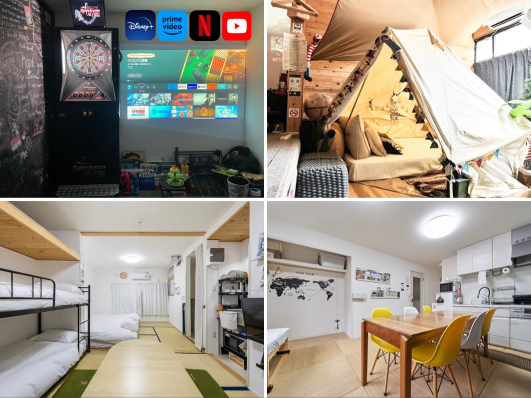 この宿泊施設に興味を持って頂いてありがとうございます! 4名様迄追加料金なし清掃代込みになっており、とてもわかりやすく表示料金で4名様まで宿泊が可能です(Airbnbサ料別) 1階は室内がキャンプ仕様になっておりグランピングテントやチェアハンモック、ダーツマシン、大画面でのゲーム、映画鑑賞【NetflixDisney+Amazon】カード、ボードゲーム40種類など遊べるアイテムをご用意しており、いつもとは違う宿泊になり楽しむ事が出来ること間違いなし 観光旅行の利用から女子会や卒業旅行、サークルの集い、誕生会などのお祝い事、マツダスタジアムも近いので野球観戦などによく使って頂いております 更に広島駅から近いこともあって観光地に行くにはとても便利な場所になっております。観光に便利なポータブルWiFiをご用意しています もし広島に旅行に来て雨が降る事もあると思いますが部屋で楽しめる場所があって良かったと宿泊したゲストから喜んで頂いております 周辺には食品やお酒など販売している薬局、コンビニ、スーパー、レストラン、カラオケ、ビリヤードなどがあり充実しています 最大12名宿泊可