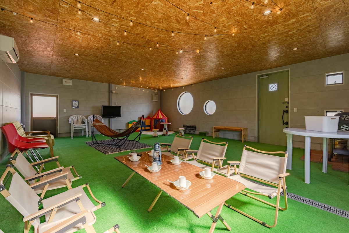お子様連れでも安心して楽しめる導線の貸別荘です。 BBQテラスはリビング・ダイニング・キッチンに面しており、室内と行き来しながら快適にお楽しみいただけます。 庭は塀とフェンスで囲まれたプライベート空間。 広い庭には大型遊具もあり、 小さなお子様連れ、ワンちゃんのご滞在にもぴったりです。 徒歩5分でビーチへ🏖️ 海水浴や釣りを気軽に楽しめる立地の、一棟貸し貸別荘です。 夏はお庭でプール遊びもできます。 貸別荘の庭からも見える、目の前の海岸からは四季折々の夕陽も楽しめます🌅 ご家族みんなで、のびのび過ごせる思い出に残る宿泊体験をどうぞ。