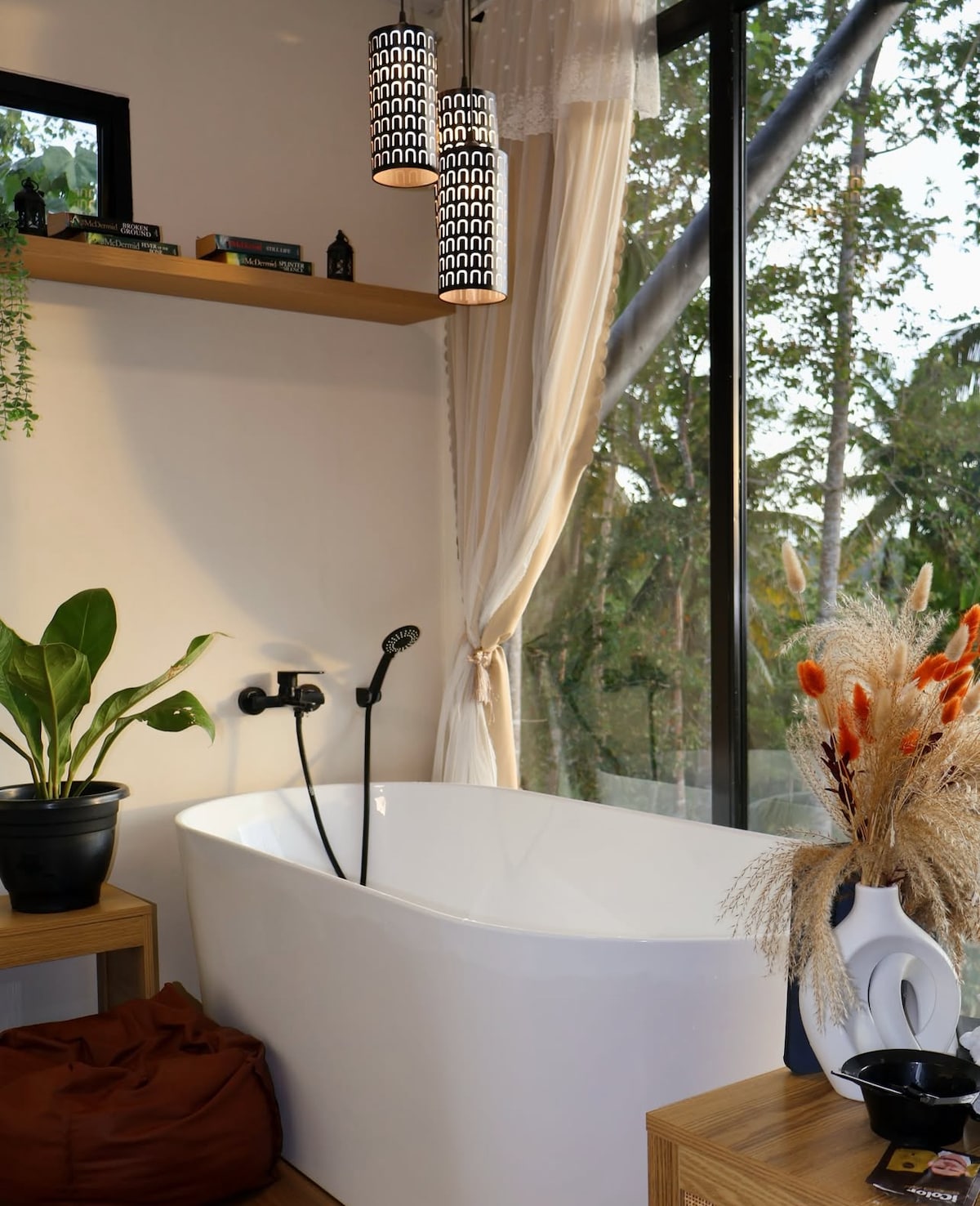 Relax in a cozy bamboo gazebo with a plush lounge, KTV/TV, and private bar. Enjoy nights around the fire pit with soft LED lighting, string lights, and a beautiful landscaped garden. Perfect for couples, families, or small groups looking for a peaceful, fun, and photo-worthy stay.