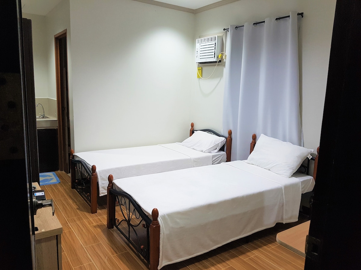 Private rooms with Private bathroom. This room is airconditioned with curtains for privacy. With 1 double bed good for 2 persons. You can also request for 2 twin beds instead. Just let us know in advance or prior to your arrival date. Inside each room, there's a cabinet, a dining table, a sink a bathroom mirror, and a water heater for the shower. You will also be provided with towels. Hot and cold water dispenser in the Reception Area. Free WIFI and pool access as well.