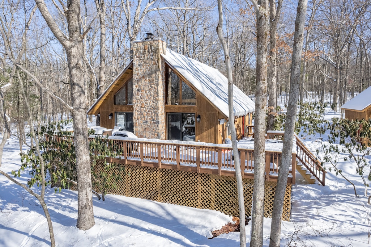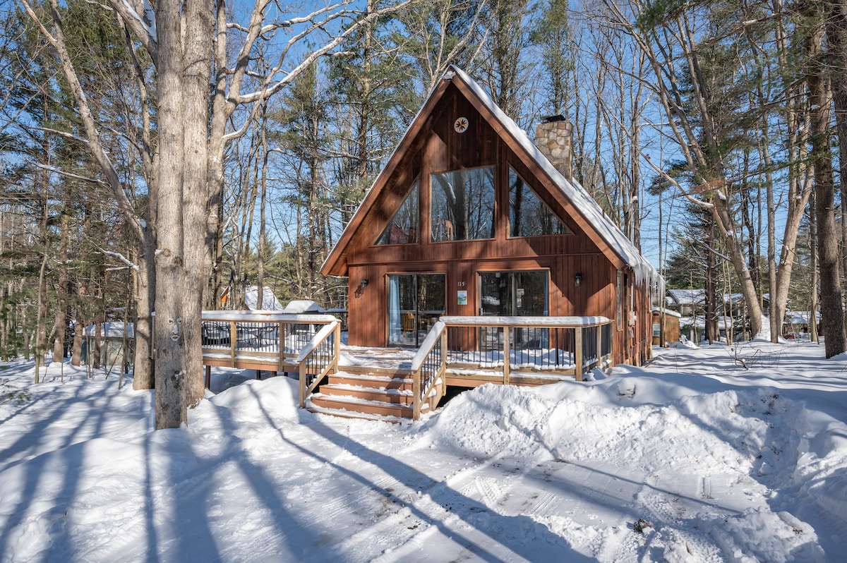 **Lake access **Fire pit **Fishing pond **Basketball courts **Private community beach and picnic area **Pet Friendly (please note in booking) **Free parking ** Keurig **Charcoal grill This A-frame cabin in the woods comfortably accommodates 6 people. It features a spacious open living area, rustic charm, large windows, cozy bedrooms, and a well-equipped kitchen for a serene and enjoyable retreat. Not to mention, lake access through the Sky Valley community!!