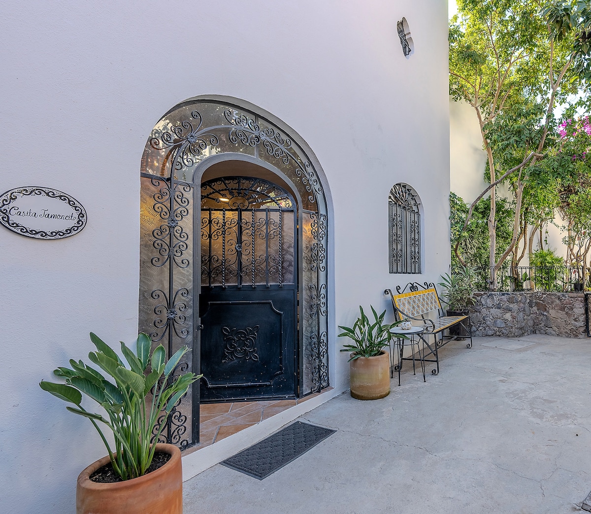 Nestled in a serene garden setting, our modern studio offers a tranquil escape just a short walk from the vibrant heart of San Miguel. Enjoy a restful stay with contemporary comforts: a plush queen-sized bed, high-speed Wi-Fi, and a fully equipped kitchenette. Start your mornings with coffee on the private patio, surrounded by lush greenery, and unwind in the evenings with a stroll to nearby cafes, galleries, and historic sites. Experience the ideal blend of relaxation and convenience.